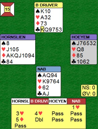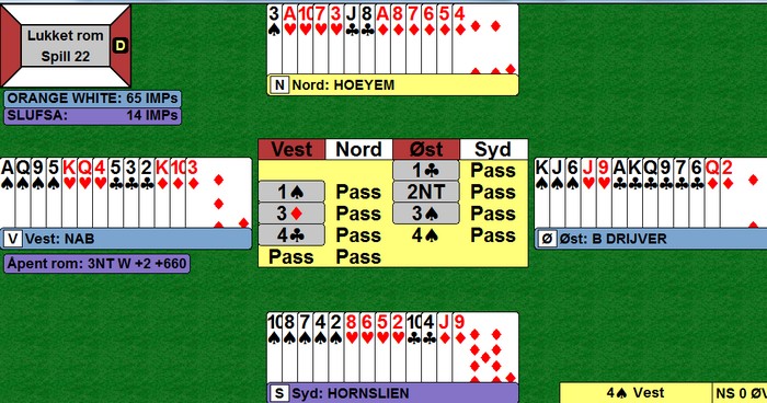 Sagt på BBO: "West was prepared to defend 4H until his partner told him it was going down." Aksel har gjort mye bra i denne kampen og nok en gang gjør han et godt valg når han tar ut 4hj dobla. 4hj vinnes kjapt ved å kappe ruteren gjennom NT-melderen. Uansett et tapt spill for Hornslien - Høyem i det syd meldte 4h og Ole - Børre slapp hjem 3NT. På hjerterkongen mot 3NT la Børre knekten. Øst dukka og Ole fortsatte med damen i håp om Kn10 blokk. Nå ble det ni stikk.
