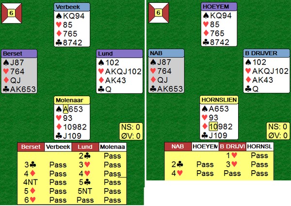 Det mangler som du ser to esser i ruterkontrakt, men det kan ikke vest vite og stamper i 6hj. Det koster 800 og 12 IMP til BLUND.