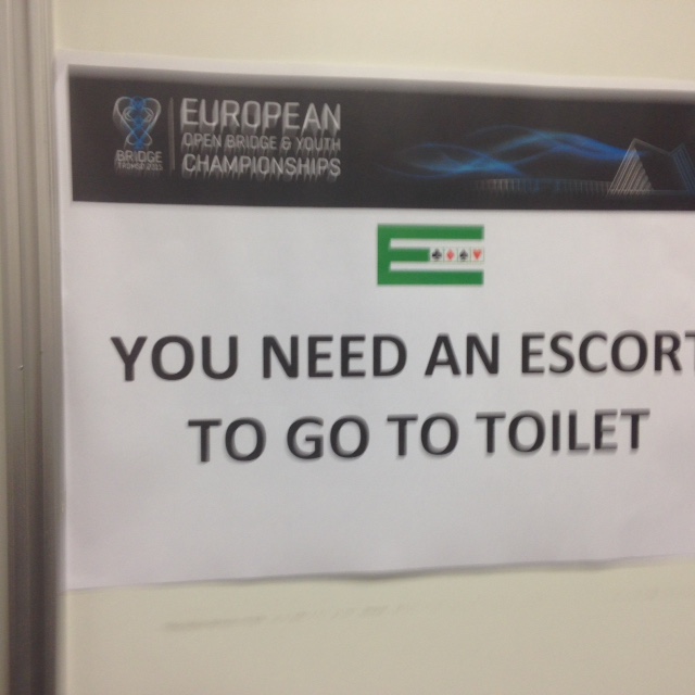 To av spillerne som vant EM lag klarte ikke å bremse i tide på dette spillet. De oppdaget at de hadde to spartapere, men da var det ikke greit at trumfen satt som den gjorde. En beit og et heldig plusspill for Helgemo og Hoftaniska. 7kl i fleisen var uheldig, så ting jevner seg ut. Drijver i øst ber om unnskylding for sin 5kl og sier at det var alt for hardt meldt å passere 4hj.