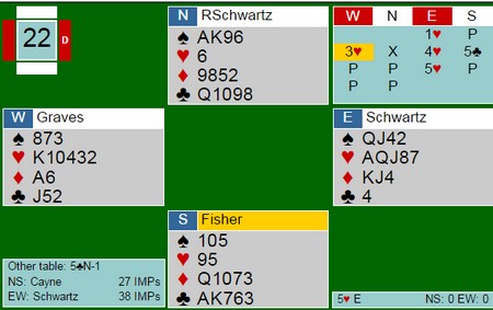 I ugunstig sone er du giver, V åpner i 2. hånd med 1 ruter, Ø svarer 1 hjerter og V gjenmelder ruter. Deretter går Ø på med Blackwood og får svar 2 ess (samt ru D) fra V og Ø avslutter med 6 NT.