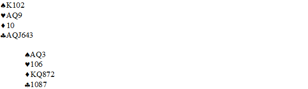 Terje Aa – Allan Livgård meldte seg frem til en fin lilleslem på dette spillet. Ved første blikk står kontrakten på sparkonge foran ess, dame, eller at ruteren sitter 3 – 3 slik at den fjerde ruteren gir avkast for spar.