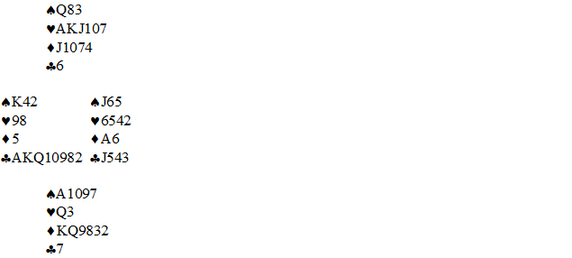 Da femte kløver ble innkassert, var sør skvist. Han måtte kaste sine hjerterhonnører for å hindre at bordet tok to ruterstikk til slutt, men da sikret hjerter knekt det nødvendige ekstra stikket.