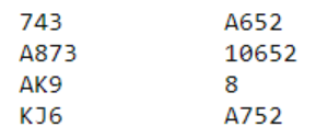 Fred Hansen spilte ut ru Jog det førte til at D, K og A også gikk i 1. stikk. Arne tok deretter de fire neste stående ruterstikkene fra dette: