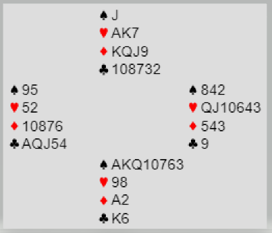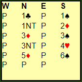 Men denne varianten hadde de ikke avtalt. Så syds 2 ruter var utgangskrav (XY), og 3 ruter var naturlig melding og viste 2-2-4-5, eller noen ganger 1-3-4-5 hvis hånden innebar et gjenmeldingsproblem som det absolutt var denne gangen. Da nord sa 3NT over syds 3 spar som viste minst sekskorts farge var det ikke lett å vite hva som er riktig med syds kort. Det kan stå slem, men det kan også være to hjertertapere fra start.