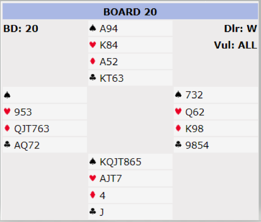 Dette var en fin måte å få tolv stikk på uten å måtte gjette hjerteren, men det ga likevel ikke godt betalt fordi som nevnt spilte nesten alle på hjerter dame hos øst og fikk tolv stikk. Så 4 spar med tolv stikk ga under middels (40%) fordi det mange meldte og vant slem. Om hjerter dame flyttes over til vest og ett annet kort over til øst ville det blitt veldig god betaling for +680 etter partiell eliminasjon og innspill, for i så fall ville de fleste andre gått bet i slem, eller fått kun elleve stikk i 4 spar etter å ha tapt ett stikk i hjerter og ett i kløver.