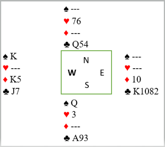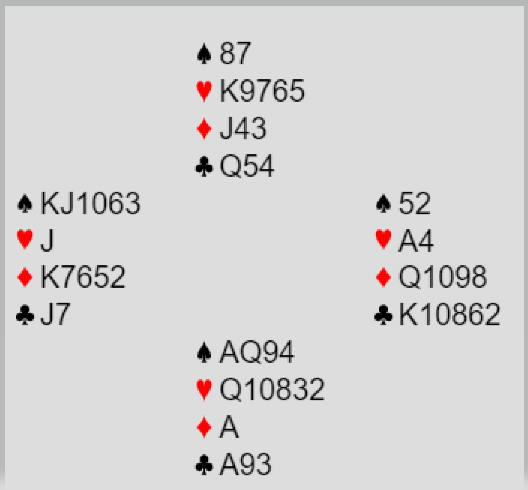 Stor spar fra nord vant første stikk, syd la styrke. Liten spar fra nord i andre stikk gikk til esset, så en tredje runde spar til vests konge. Nå måtte det gjøres et avkast fra øst, og spillefører kastet ruter 6. Selv om han godspiller hjerteren blir det bet. Nord får ett stikk i hjerter og forsvaret får da tre stikk i spar og hjerter konge. Syd må få ett stikk til, for en av kongene sine. Spillefører får ikke mer enn fem hjerterstikk, ett sparstikk og for de to minoressene.