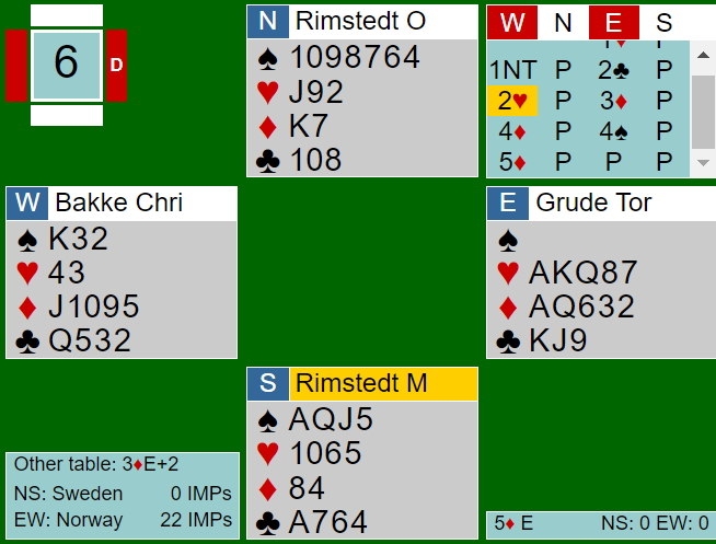 Jan Kristen Lutro (N)- Trond Are Nitter (S) meldte også i fred, men her passet Nord i åpning og Syd kravåpnet med 2 kløver: