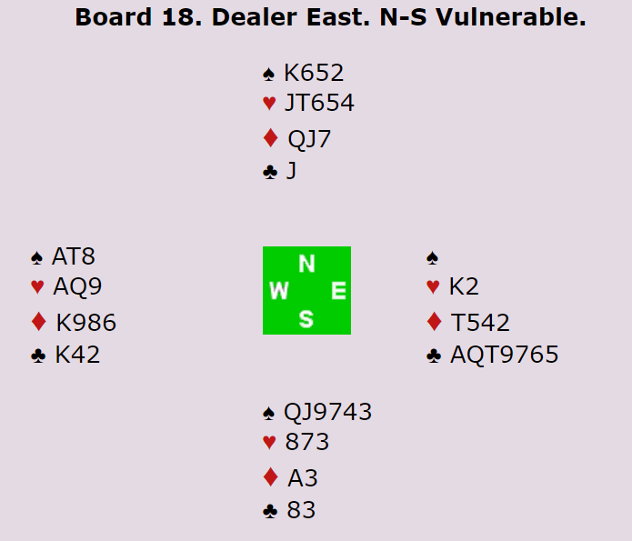 4 ruter var altså ment som cue- bid og han viste med 6 hjerter at han hadde 4-6 i majorfargene. Godt meldt, men med kl J ut fra Øst skulle Gjøs spille hjem 12 stikk, minst. Hva ville du satset på? Utspillet gikk til kl D og Gjøs satset på at 13 stikk kanskje kunne vinnes. Derfor dro han ru A fulgt av ru K men da jeg i Vest på siste la ru D ble han betenkt, men satset likevel på at jeg hadde minst 3-kort ruter. Ru 3 til9 hos Marthinussen, røff i bordet og ru 10 hos meg ga info nok. Inn på hj A og en 4. ruter det Nord var utsolgt godspilte ru 5 i bordetsiden Vest hadde hatt ru DJ103 fra start. På hj K og hj Doppstom ingen vansker og de siste stikkene ble tatt av ru K5 med avkast av sp 9 8. 13 stikk og topp!