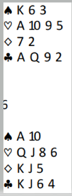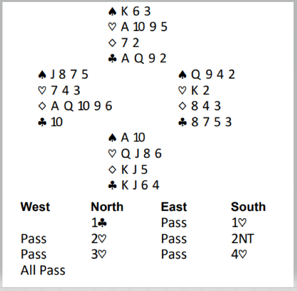 Åpning med 1 hjerter er vel naturlig og Roar hadde god grunn for å satse, bruker du Stsnberg vil hopp til 2 NT våre klart svaralternativ, noe som Marthinussen og undertegnede hadde i bruk og 2 NT utgangskrav. Roar (og jeg) hadde i syd dette: