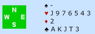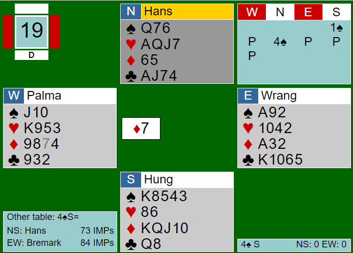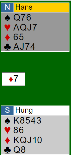 Mot Hoftaniska - Vist som N/S åpnet øst med 1 hjerter. Syd sa 1 spar og vest støttet til 2 hjerter. Nord sa 4 spar nå som vel på en måte er en undermelding (?), men et praktisk valg. Øst gikk på med 5 hjerter og syd sa 5 spar. Nå hadde nord så mye ekstra at det virket litt logisk å legge på til slem. At syd er renons i hjerter så nå ut som temmelig sikkert.