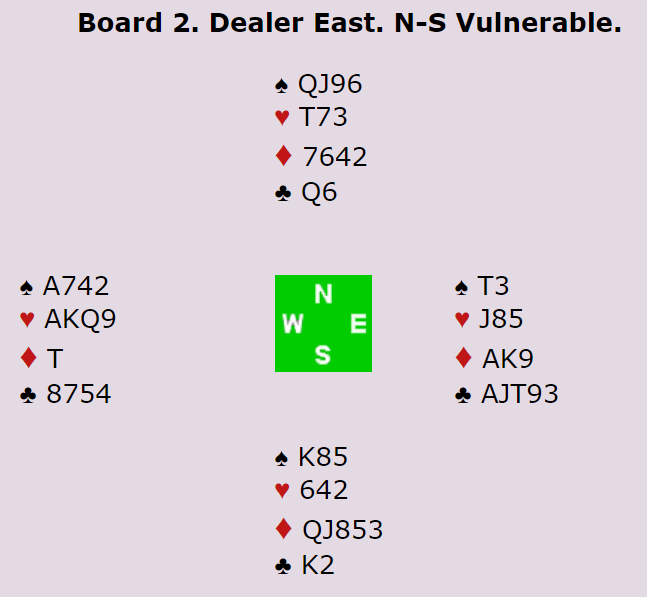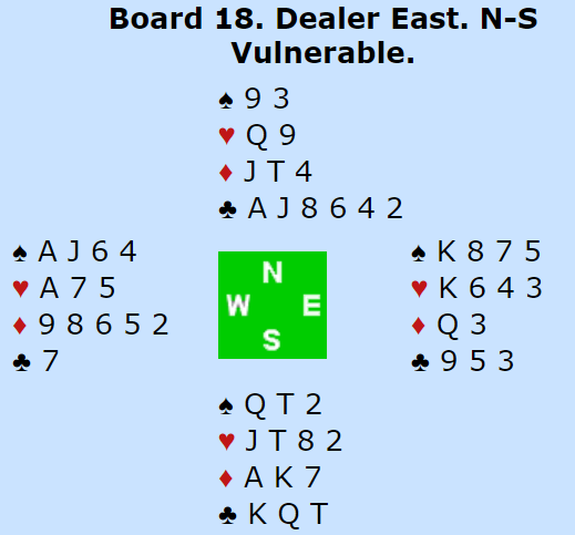 Med litt forsiktig pass i stedet for å melde 3 ruter fra Vest fikk da Kjennbakken vist sin langfarge og da det deretter gikk pass rundt var det etterpå enkelt for Nord å snelle inn 9 stikk som ga dem topp med 110 inn. Ø-V kunne fightet i ruter og den kontrakten ville gitt 10 stikk! Thor påpeker at han selv høyst kan ha dobbelton i spar, for med 3- kort kan han doble for å vise det hvis Torfinn over 2 ruter hadde passet.