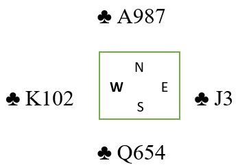 For at intrafinessen skal kunne virke må han til høyre ha tieren eller knekten dobbel. Spilles esset og en til blir det to tapere. Løsningen er å spille syveren fra nord og la den seile hvis øst legger liten. Vest stikker med tieren og blir sittende igjen med K-2. Idet spillefører kommer inn igjen sørger han for å spille kløver fra syd i fargens andre runde, og da må damen spilles. Vest kan ingen ting gjøre. Dekker han vinner esset og knekten faller, åtteren tar ut vests kløver 2. Dekker ikke vest får damen seile - kun en kløvertaper. Det hjelper ikke om øst legger i knekten i første kløverrunde. Da dekkes med damen og vest stikker med kongen. I neste kløverrunde har vest 10-2 og øst har ingenting å hjelpe til med, så liten til nieren løser fargen med en taper. Merk at spilles slik får man to tapere om øst har kongen dobbel (hvis han legger liten første gang) eller kongen tredje.