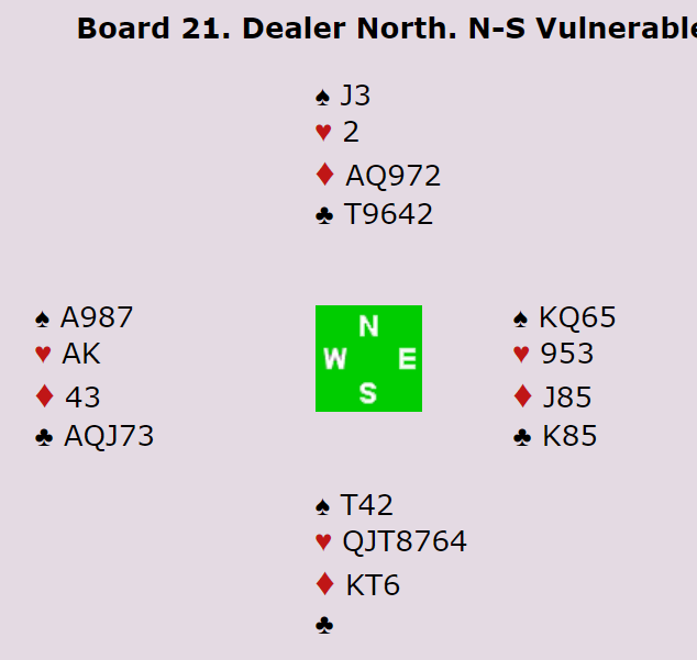 Styrken var mer enn god nok for løft, han valgte 5 kløver siden det er fare for mange «bortkastede» poeng i hjerter. Men 5 kløver vil lett gi dårligere score enn 3 NT så nå valgte jeg å avslutte med løft til 6 kløver. Det satt supert, med kl D i Øst lot seg fiske opp og to stjelinger i hjerter avslørte at Øst der hadde hj KD7 så fargen ble godspilt. Topp som eneste par i lilleslem.