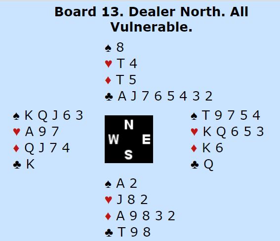 Der Christian Bakke satt øst og Marianne Harding vest startet det med 1 spar fra syd, dobler fra vest og 4 spar fra nord. Nå sa Bakke 4NT – to steder å spille – og vest valgte å vise kløveren. Hun hadde imidlertid nok til å ta sjansen på slem følte hun og sa 6 kløver. Bakke korrigerte til 6 ruter som ba vest velge mellom de to fargene, og 6 ruter ble kontrakten.