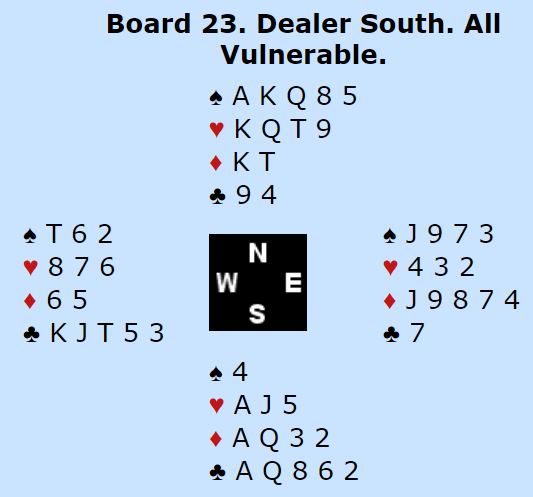 Det var noen som var i storeslem og gikk bet, og det var noen få i hver klasse som gikk bet i 6NT da de låste seg på «en av to finesser) og prøvde kløver til damen, og da det gikk galt spilte de senere ruter til tieren. En spilleplan som selvsagt ga en bra sjanse, men ikke god nok.