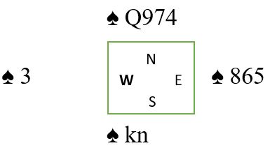 En annen ting mange spilleførere overser er når de faktisk rår over en ganske sterk kombinasjon i den utspilte fargen, kanskje en kombinasjon hvor mellomkortene er i ferd med å vokse til stikk. Her er et eksempel på en slik farge:
