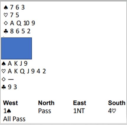 Vests sparåpning viste minst femkorts farge. Etter at begge motspillerne hadde meldt avsluttet syd meldingsforløpet med 4 hjerter. Der kan du ta over. Planlegg spillet etter at vest har spilt ut A-K i kløver, damen kom på fra øst i andre stikk, og så kommer en tredje runde kløver fra vest mens øst kaster en ruter. En opplysning til, i første trumfrunde kaster vest en ruter. Så du vet øst startet med tieren fjerde i trumf.