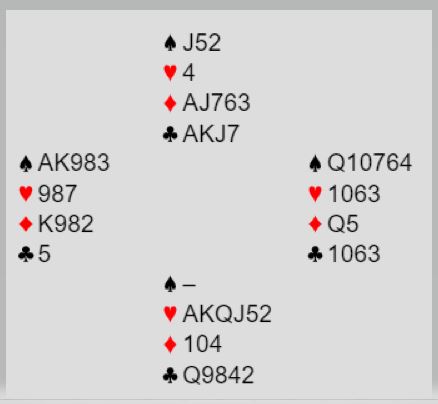 Slik det var stod det tretten stikk i kløverkontrakt. Hjerteren ga fire (!) avkast for rutere hos nord, og dermed kunne syds andre ruter trumfes på den korteste trumfhånden. Syds hånd blir hovedhånd, og der eksisterer det ikke tapere etter hvert,13 stikk og +940.