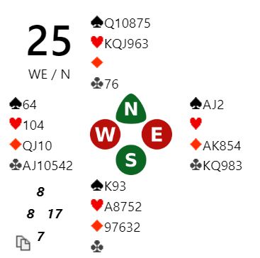 Merk at 7 kløver står da det er avkast for spar på ruterfargen. Merk også at N/S kan vinne tolv stikk i sparkontrakt om det tippes riktig på hvor spar knekt er plassert. I dette spillet står det altså storeslem Ø/V og lilleslem N/S (med heldig sparvalg)!