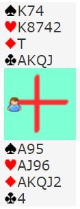 Han som satt nord mot oss er en bra spiller som bannet stygt etter å ha lagt ned hjerter konge og oppdaget renonsen hos øst. Men han ga ikke opp. Hvis vest følger farge i de fargene han velger å cashe kan det med endel sitser ende med et sluttspill hvor vest med tre kort igjen må stjele seg inn bare for å spille trumf rett inn i A-J. Men her fikk vest stjålet tidligere, i tredje runde kløver, og så fikk han fridd seg. Da måtte han få betestikket med ett trumfstikk til.