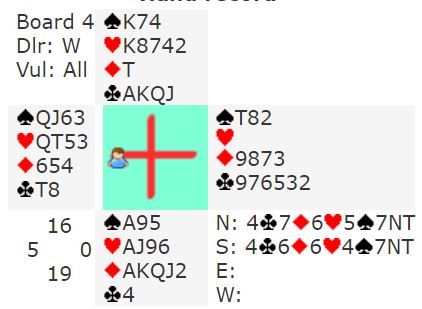 Det ble hjerterkontrakt med dette. Det er ikke så rart, kanskje, for nord åpner med 1 hjerter, og syd går naturlig nok for hjerterkontrakt og svarer de fleste steder 2NT, Jacoby, eller Stenberg som vi kaller det i Norge. Det viser som de fleste vet 4+ kort støtte i majorfargen og er utgangskrav. Senere blir det fort at syd spør om nøkkelkortene, og da finner han ikke ut at nord har en så knallsterk kløverfarge, men får informasjon om at makkerparet mangler trumf dame. Da blir det enten å satse på storeslem som sett fra syds sitt synspunkt normalt er avhengig av at ess-knekt-fjerde mot kongen tynt femte løser seg uten taper, eller gi seg i lilleslem hvor det normalt blir tolv eller tretten stikk. Ingen i makkerparet vet at de faktisk har tretten toppstikk i grand kortene med kun to hjerterstikk!