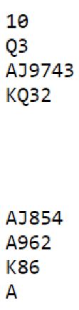 Med åpne kort kan det vinnes tretten stikk i ruterkontrakt. Da må sparstikk godspilles for hjerteravkast (spar ess, så spar til stjeling som tar med seg både kongen og nieren fra øst, så senere presses vests dame ut mot trumf og åtteren står!). Dessuten kan ruter ess spilles fulgt av finesse over øst idet tieren faller fra vest, men det er langt i fra noe opplagt valg. Det er sannelig ikke lett å treffe så godt i spilleføringen uten noen indikasjoner, og de som var i slem gikk bet, unntatt ved ett bord.