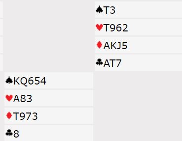 Etter pass fra syd åpnet vest med 1 kløver (2+ kløver, vanlig åpning). Nord sa pass, øst viste hjerteren og syd meldte inn 1 spar. Vest doblet for å vise trekorts hjerter. og nord støttet sparen på to-trinnet. Ofte vil vi slik vi spiller melde på tre-trinnet direkte med firekorts trumfstøtte til en majorfarge, enten med 3 spar (sperrende), eller en melding som viser "mixed raise", dvs. firekorts trumfstøtte og typisk 7-9 poeng (vi bruker fargen under 3M som "mixed"). Men her har syd passet først, så nords støttemelding på to-trinnet kan nok godt innebære firekorts støtte, men det er ofte kun trekorts støtte. Øst sa 3 spar, spørsmål om hold, og vest meldte 3NT.