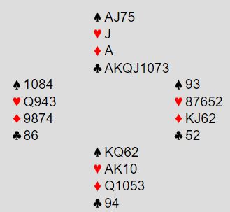 Men selv om makker bare høyner til 4 spar over 3 spar går du selvsagt på med 4NT – Key Card Blackwood. Da får to 5 spar fra syd, to nøkkelkort og trumf dame. Følgelig har han spar konge-dame og hjerter ess. Mer behøves ikke, det er ikke lenger noe problem, for du kan telle tretten sikre stikk (4 sparstikk, hjerter ess, ruter ess og 7 kløverstikk). Konklusjon 7NT, det kan ikke være noe å spille om i den kontrakten.