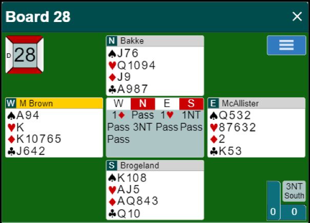 Det blir flere rundekamper (5.runde) som kan bakspilles på RealBridge fremover. Søndag var det et godt lag fra Namsos BK som møtte Tromsø BK. Sistnevnte klubb er et storlag i NM-historien med mange medaljer og gull over flere tiår. På laget spiller Peter Mastrander som spilte på storlaget som dominerte i mange lagfinaler så lenge siden at en av lagkameratene på årets lag, Nicolai Heiberg-Evenstad ikke var påtenkt en gang. Heller ikke Marstranders makker Kristian Barstad Ellingsen var så stor at han kunne snakke rent den gangen Marstrander og Tromsø herjet i flere NM-finaler. Nicolai spiller med pappa Stian Evenstad. Hvis dette Tromsø-laget kommer seg gjennom 6.runde også vil de bli å regne som en av medaljekandidatene i finalen