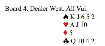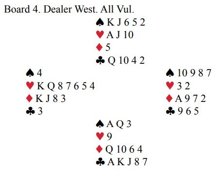 Noen la simpelthen ned ess-konge i trumf, stjal så en ruter og spilte kløver ess og mer kløver. Da ble det bet i 4 hjerter siden hele spillet så slik ut: