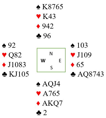 Det svaret er vel på en måte standard (?), men man vet egentlig at det ikke er utspillsblink når det blir presentert sånn som et spørsmål. Ved bordet er dog ruter knekt normalutspillet for de fleste. Og det ble hva Bakke valgte. Dermed var en gylden sjanse til å få et kjempespill ødelagt, for slik så hele spillet ut: