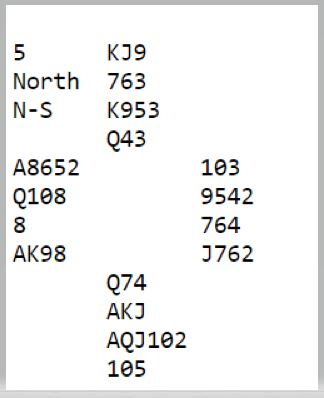 Det kinkige for spillefører er dog om det kommer liten kløver ut fra vest. Da kan det godt være riktig å spille liten fra nord i håp om K-J eller AJ fjerde eller femte hos utspilleren. I så fall blir det fire kløverstikk og spar ess til forsvaret. Det skjedde imidlertid ingen steder.