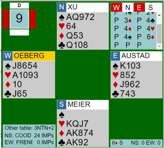 Merk stillingen nederst til venstre. Det norske laget lå under med 0-24 (det var en feilscoring på BBO så det var faktisk 0-25 på det tidspunktet). Og her meldte Meier-Xu den brukbare slemmen 6 ruter. Om ruteren sitter 3-2 er det svært gode sjanser, men det må litt til før det blir tolv stikk.