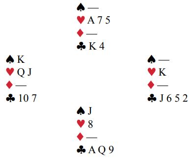 Det står tretten stikk ved å skvise øst i spar og kløver. Det kommer av seg selv om spllefører rett og slett tar alle stikkene i rødfargene. (Han tar også av seg spar ess og stjeler spar, over i ruter og stjeler en spar til for å se om konge kanskje sitter tredje). Sluttposisjonen før den siste ruteren blir AQ98 i kløver og spar dame hos syd. Øst har da fire kløver og spar konge og må kaste før bordet på den siste ruteren fra nord. Altså må han enten kaste spar konge (da forsvinner kløver fra syd og resten står), eller kaste en kløver (da forsvinner spar dame fra syd, og kløveren går).