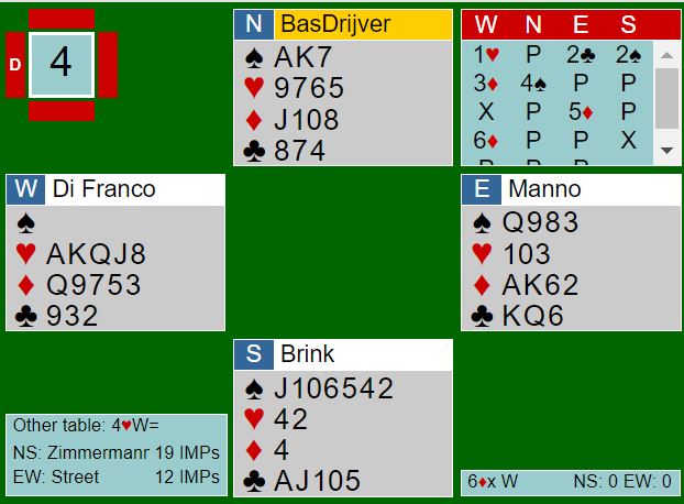 Tre par var omtimistiske og havnet i slem, alle tre i 6 spar. Og alle tre vant tolv stikk siden vest ikke fikk med seg for ruter ess - delt topp for +980. Vinnerparet var blant de heldige slemmelderne.