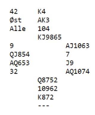 Det er ikke så ofte man vurderer trumfutspill fra knekten dobbel, men i dette tilfellet er det trumfutspill som gjelder samme hva syd har. Han må beskytte sparstikkene sine så ikke spillefører kan få trumfet spar hos vest.