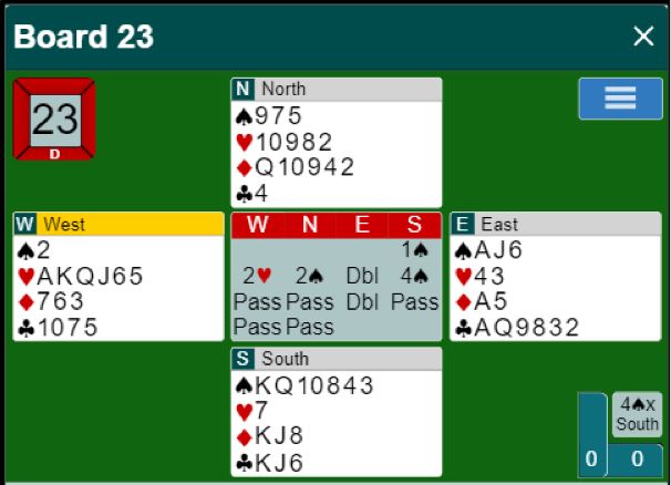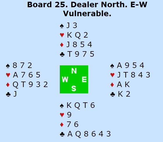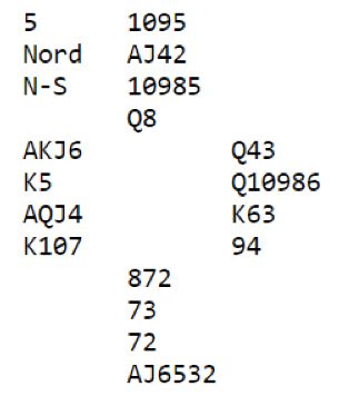 Et hverdagsspill som ville fort blitt glemt i lagkamp, Ø/V spiller 3NT hvor det bli minst ni stikk uansett hva som skjer. Så i lagkamp ville spillet blitt uavgjort, eller gitt +/- 1 eller 2 IMP til ett av lagene.