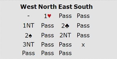 Ett par til noterte +920, Stian Evenstad og Lasse Aaseng, men ved det bordet kom spar ess ut mot 6 ruter så da ble det nok lettere. Dessuten hadde syd doblet Stayman 2 kløver, så det ble greit å ta kløverfinesse i stedet for hjerterfinesse. Dermed ble det to sparavkast og ett kløveravkast for tre hjertere også ved det bordet.