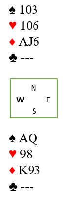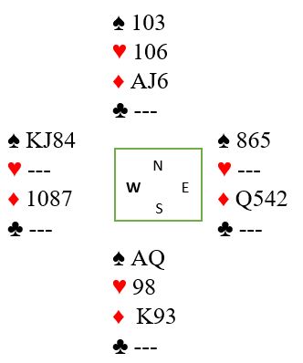 Nå spilles altså spar ess og spar dame, og som allerede sagt er det ingen problemer om øst vinner med spar konge. Men som du ser vinner vest det stikket, og han må spille ruter. Med liten ruter fra vest får du med denne kombinasjonen hos N/S to sjanser ved å legge liten fra nord. På ruter fra vest og sekseren fra nord må øst på med damen slik det her sitter, og da står jo A-J. Det er ruter 9 som er så viktig. Men kanskje produserer øst ruter 10 i det stikket. Da stikkes med kongen, og da må ruterfinessen prøves. Det hjelper selvsagt ikke om vest spiller ruter 10 idet han er inne på spar konge, for da dekkes simpelthen med knekten, og nieren blir god.