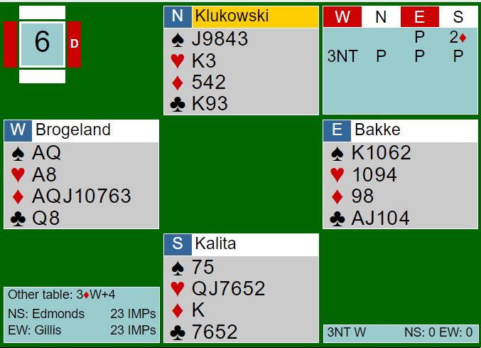 I 3NT lasjerte Brogeland nords utspill hjerter konge for å kutte fobindelsen mellom nord og syd i tilfelle ruter konge satt hos nord. Inne på hjerter ess i andre stikk spilte han spar dame som ble stukket over med kongen, så ruter med tanke om å ta en finesse. Kongen kom på, og deretter tok han resten. Ø/V +690 og 11 IMP i favør GILLIS.