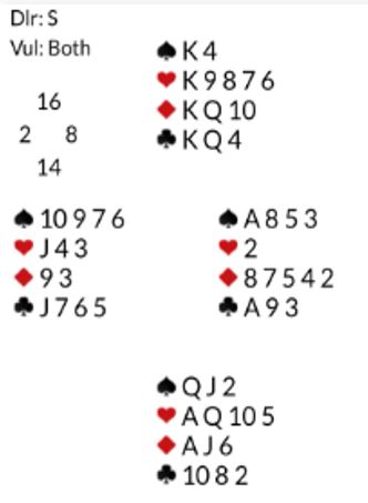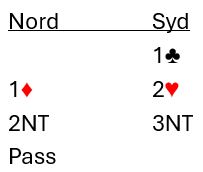 Over 1 kløver viste 1 ruter 4+ hjerterfarge ("kløverføringer"). Da viser åpnerens hopp  2 hjerter vanlig åpning, men alltid firekorts støtte. Meldingen 2 NT var så rundekrav som ba om flere opplysinger. Bedre informasjon enn å si at hun har trillrund hånd kan ikke åpneren gi, og det gjorde Elisabeth med 3NT. Da tok Sofie sjansen på å spille 3NT, og det var en helt bevisst sats selv om hun altså visste de hadde nikorts trumftilpasning i en majorfarge! Det er vel modig og god par-bridge med disse kortene og den informasjonen hun hadde?