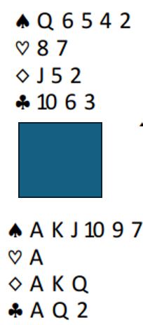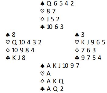 Med syd som giver og alle i sonen åpnet syd med 2 kløver. Da han litt senere fikk sparstøtte fra makkeren ble det meldt 6 spar. Vest spilte ut ruter 10.