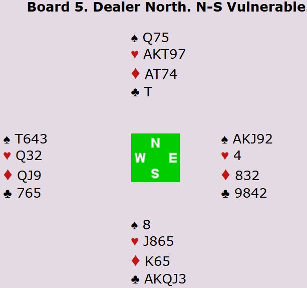 Nord åpnet med 1 hjerter, og øst meldte inn 1 spar. Syd svarte 2NT, minst firekorts hjerterstøtte og gode kort. I de videre meldingene fikk syd vist singelton spar. På et tidspunkt ble det nord som spurte om antall nøkkelkort med 4NT. Svaret var 5 ruter – ett nøkkelkort (kløver ess). Da ble det ikke plass til å spørre om trumfdamen, men med minst ni trumf til sammen satset nord på 6 hjerter.