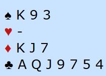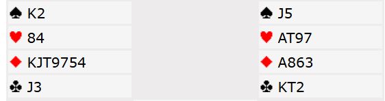 Så det er ingen god slem i dette spillet. Den beste slemmen hvis man er veldig optimistisk og går på til seks-trinnet er vel 6NT spilt av syd (kløveren beskyttet) som kun avhenger av sparfinessen. Men både 6 ruter og 6 hjerter har selvsagt sjanser og kan gi gevinstspill hvis man tråkker på gassen og melder slem.