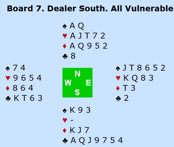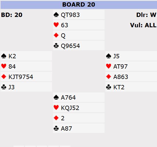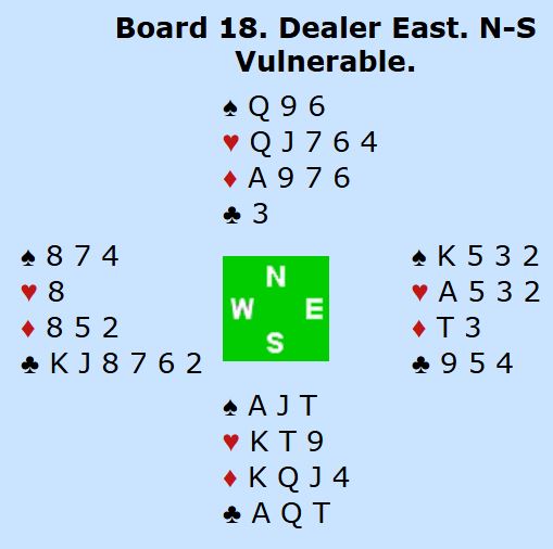 Ved det andre bordet meldte øst inn kun 1 spar. Da fikk syd hoppet til 3 kløver. Det fulgte en lang meldeserie som jeg ikke kan si så mye om uten å kjenne parets avtaler. Syd sa til slutt 6 kløver, men nord avsluttet med 6 ruter. De hadde funnet toppkontrakten som dog måtte spilles litt forsiktig. Men alle som var i 6 ruter (fire av åtte N/S-par) vant den, og en av dem fikk tretten stikk. Det norske paret var alene om å gå bet i 6 kløver. Ett N/S-par til gikk bet i slem, men de var i 6NT. Dessuten var to N/S-par kun i utgang.