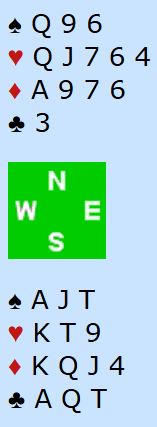 Øst er giver og N/S i sonen. Etter pass fra øst åpner mange på syds plass med 2NT. Da har nok nord litt for lite til å tenke på slem om ikke syd superaksepterer en overføringsmelding til hjerter. Det normale er å havne i 4 hjerter, eller kanskje 3NT om nord overfører til hjerter og foreslår 3NT.