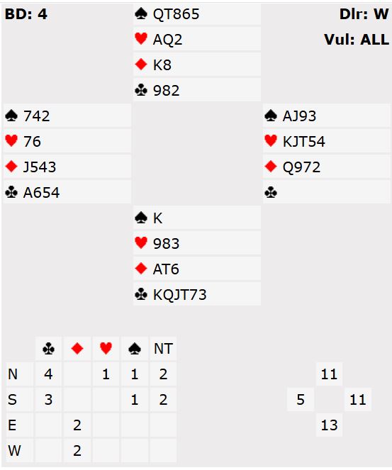 Ved de fleste bordene spilte øst ut hjerter. Spillet var over på sekunder, og noen steder ble det overstikk.