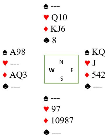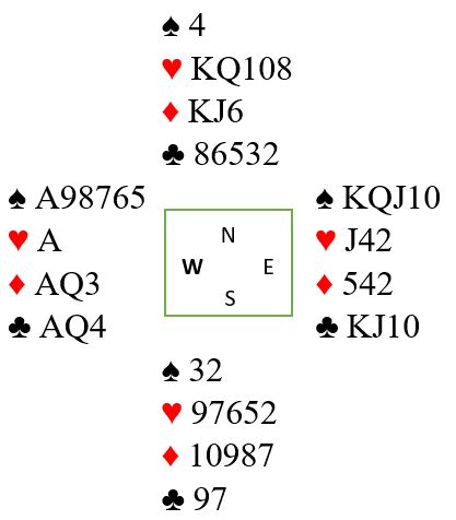 Litt erfarne spillere bør kjenne igjen mønsteret i dette spillet. Det er mange trumf på hver side og siderfarger som kan elimineres før problemfargen røres. Det som er fordelen den utspilte hjerter konge gir er at du vet så godt som 100% sikkert vet hvor hjerter dame er plassert. Hvis ruter konge sitter bak A-Q kan det for eksempel sitte slik fra start: