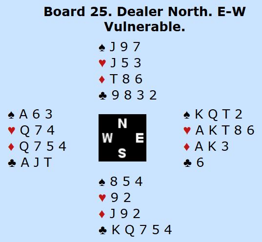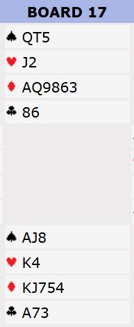 Resten spilte utganger N/S. Å spille 5 ruter med elleve stikk ga hårfint under middels, mens +460 for 3NT eller 4NT med elleve stikk ga 86% til N/S.