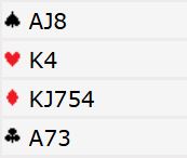 Men altså, han om det...det ble altså opplysende dobling av det. Vest passet, og som nord hoppet jeg til 3 ruter som her viser oppunder åpning, kanskje bare en 8-9 poenger (?) hvis det er meldt med lang ruterfarge. Øst meldte 3 hjerter, og syd foreslo 3NT. Det gikk to ganger pass tilbake til øst som ikke ville gi seg: 4 hjerter!